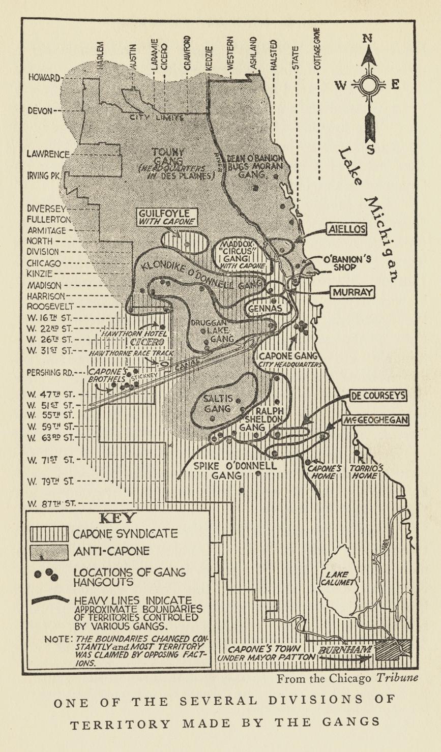 According to this 1925 gangland map from the Chicago History Museum’s archives, Capone’s south side family home was well within the Capone Syndicate territory. While Capone’s house was on the south side, his territory and syndicate branched extensively throughout the city. Throughout Prohibition, beer wars were waged, and gangs fought over territory. Learn more about the beer wars and Al Capone’s rise to power on an upcoming Chicago Crime Tour or Night Crimes Tour.